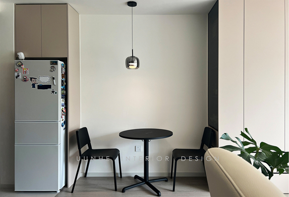 空間整體用色較為淡雅的奶白色 暖灰色系的柜體搭配鋼玻隔斷 餐桌吊燈+鋼玻裝飾柜形成空間一景 增強空間的功能分區(qū)的同時不失空間的聯(lián)動性